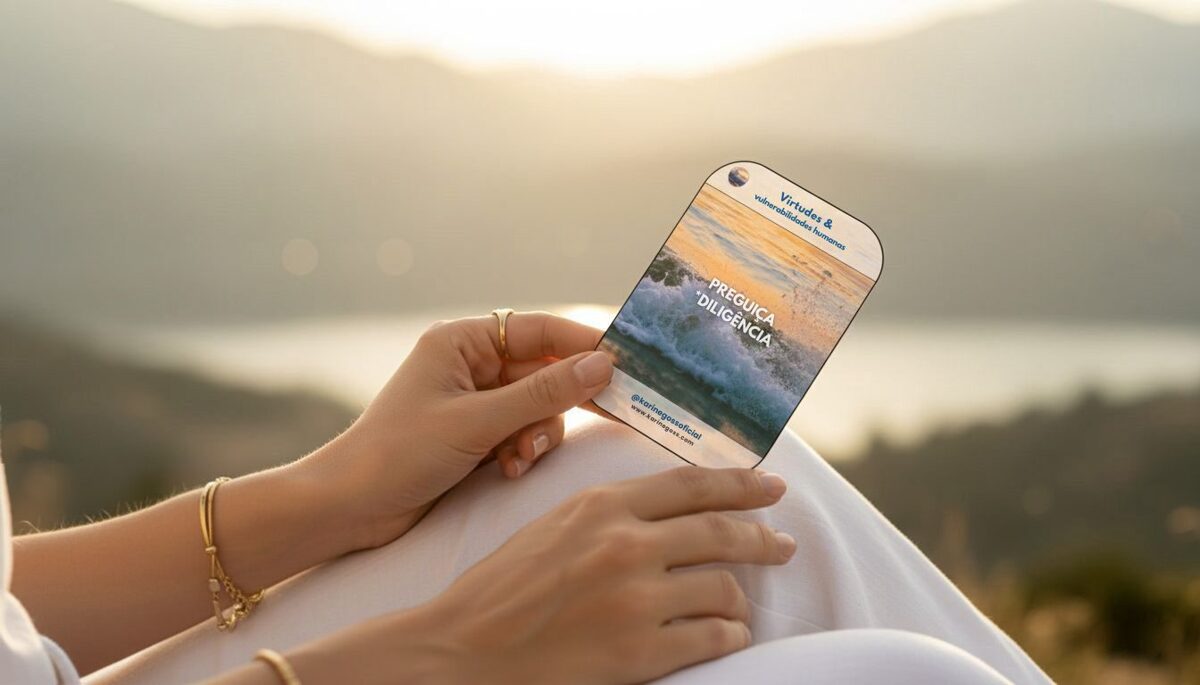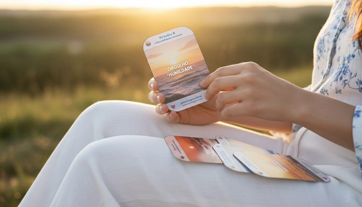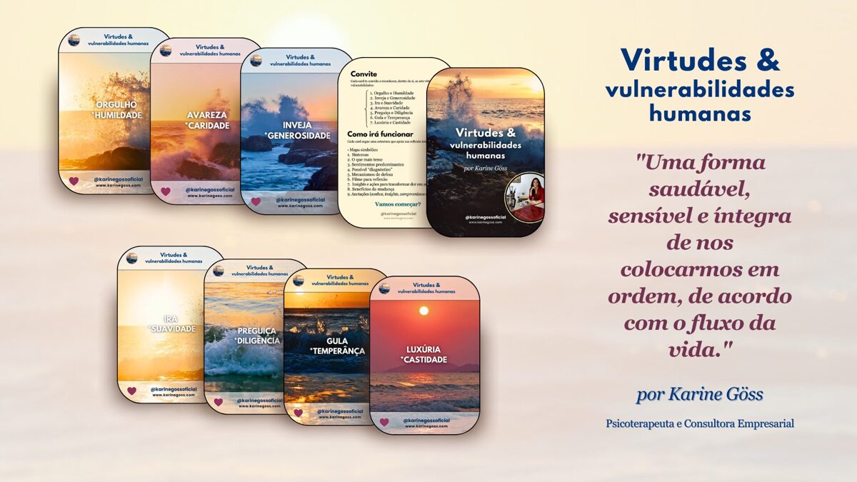 Cada card traz um mapa simbólico que revela diferenças sutis entre potência e autossabotagem — e aponta a virtude que pode restabelecer equilíbrio e caminhos possíveis de transformação.